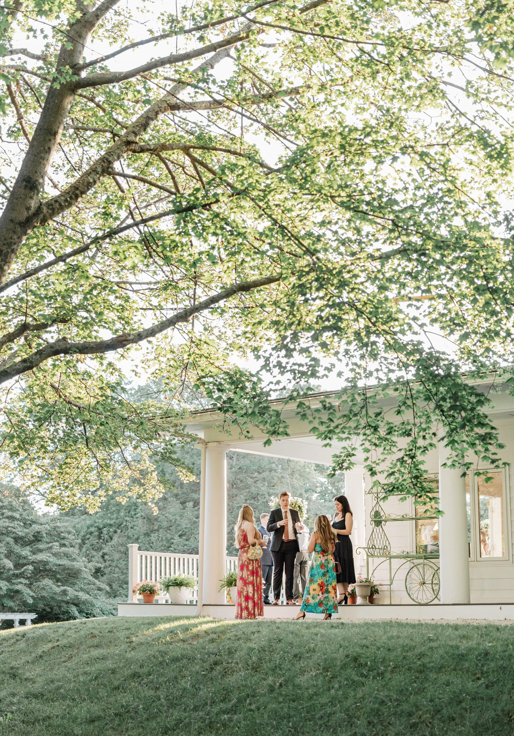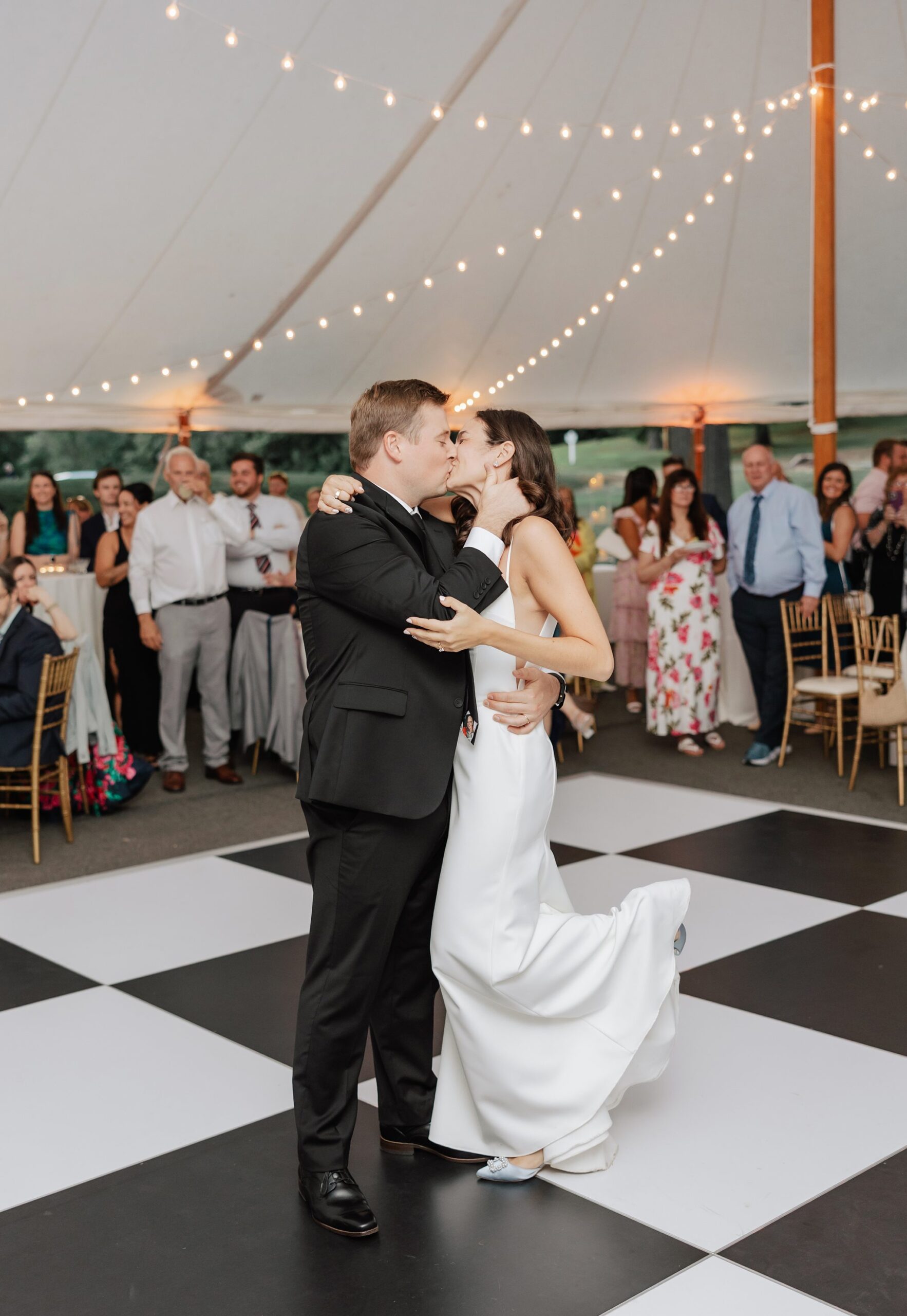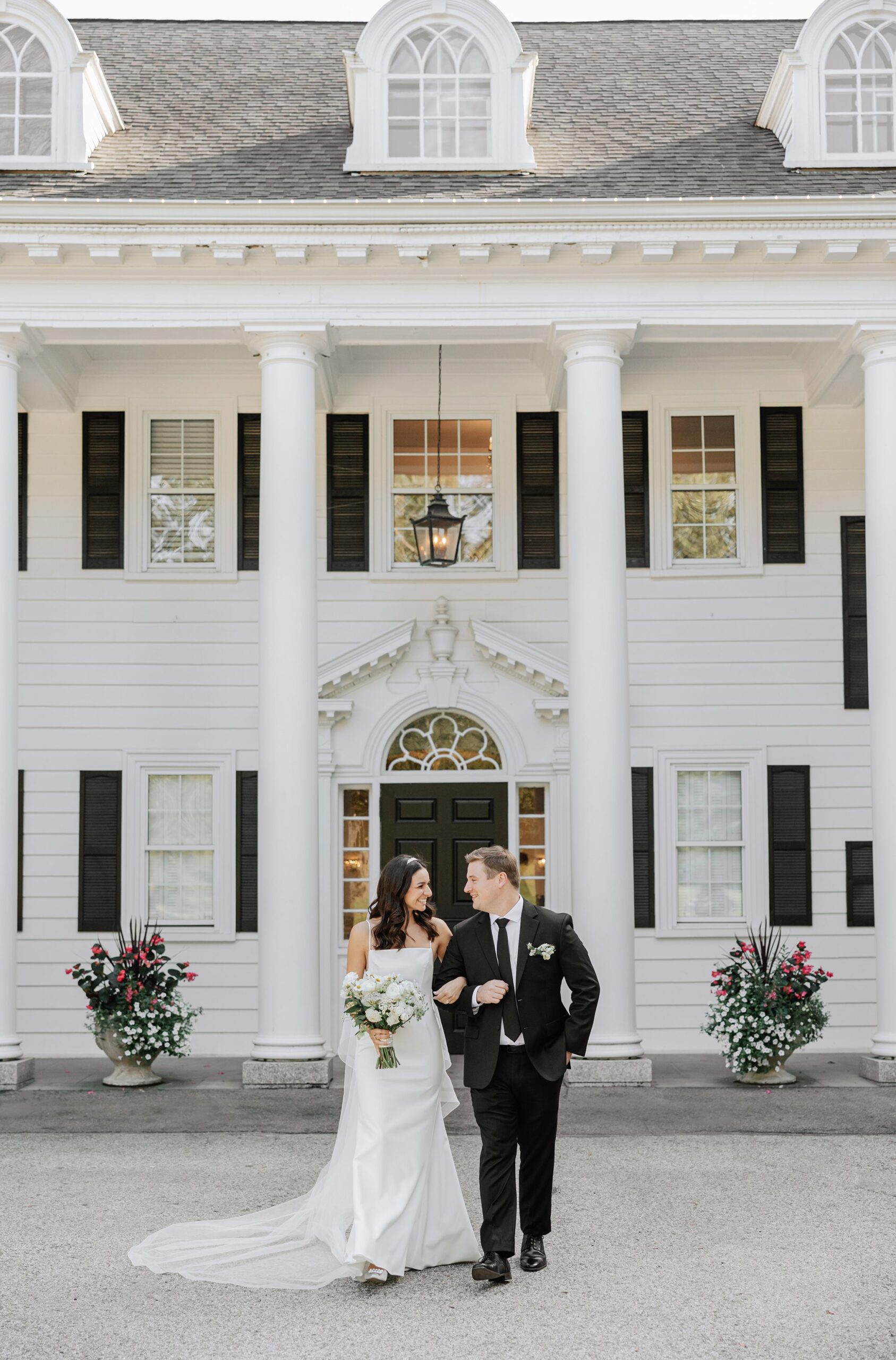 Julia and Pat’s summer wedding at Floriana in Ipswich, MA was the definition of effortless joy. Set on a historic New England estate, the day unfolded exactly as they hoped – inviting guests to show up, have a GREAT time, and truly celebrate. Loved ones wandered through the gardens, gathered around the fire pit as the sun set, and danced late into the night beneath a sailcloth tent on a black and white checkered dance floor, complete with playful pink feather boas. This was all before the espresso martini tower, too! The celebration was especially meaningful knowing that Julia has spent years as a wedding coordinator at the nearby Willowdale Estate, and many of her longtime colleagues were present throughout the day, from the ceremony, to the catering staff, to her favorite DJ the dance floor. Full of laughter, connection, and heart, this Floriana wedding was a beautiful reflection of who Julia and Pat are.